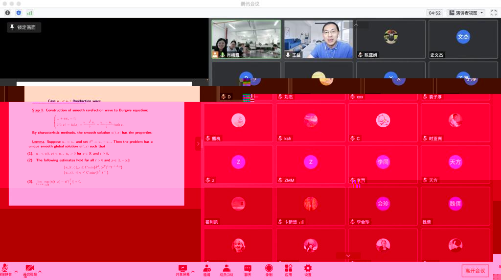 報告中,王益教授首先介紹通常情況下一維(或高維)可壓縮Navier-Stokes方程解的漸近行為(時間漸近穩定性和粘性消失極限)被對應的可壓縮Euler方程的平面Riemann問題所決定。接着王益教授分别介紹了一維可壓縮Navier-Stokes方程粘性激波和稀疏波的穩定性研究進展。同時報告了近期的一個研究成果:利用零質量條件證明了一維可壓縮正壓Navier-Stokes方程粘性激波和稀疏波的組合波的時間漸近穩定性。報告結束後,與會的老師和研究生就自己所感興趣的問題與王益教授進行了熱烈的讨論,參會師生受益匪淺。