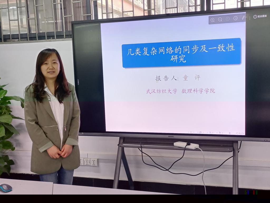 童評老師進行了題為“幾類複雜網絡的同步及一緻性研究”的報告。報告介紹了複雜網絡同步和一緻研究的背景,應用圖論、矩陣理論和穩定性理論,首先研究了個體動力學不滿足QUAD條件的複雜網絡的指數同步問題,并将文章提出的方法用于經典模型,最後進行了數值仿真說明理論的有效性,其次研究了耦合拓撲結構是連續時變的多智能體系統的有限時間一緻,給出了達到一緻的最小時間估計,并把提出的一緻算法用于固定拓撲結構和切換拓撲結構,最後進行了數值仿真說明方法的有效性。