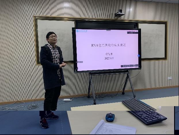 時亞洲副教授做了題為“RNA 空間結構的從頭預測”的報告。報告對現有的RNA空間結構的預測方法進行簡單的綜述,在此基礎上,進一步詳細介紹提出的粗粒化模型。該模型不僅能夠從頭預測(即僅基于給定序列)RNA分子的空間結構,還能定量預測溫度及離子條件對RNA結構的影響。