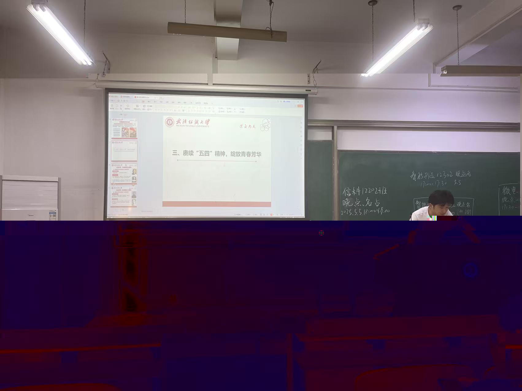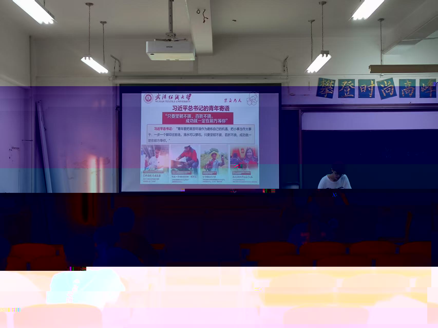 最後,聯系實際生活,班委向同學們列舉紡大青春榜樣的事例,學習各教授、學長學姐們的感人事迹,讓同學們對五四精神的力量有更加深刻的感悟,從而激發我們頑強拼搏揮灑青春的鬥志,用腳踏實地的奮鬥書寫我們的青春華章。