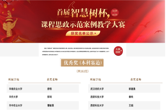首屆“智慧樹”杯課程思政示範案例教學大賽旨在深入貫徹習近平總書記關于教育的重要論述和全國教育大會精神,貫徹落實教育部《高等學校課程思政建設指導綱要》,挖掘、展示在線課程及混合式課程的課程思政教學設計及建設成果,共吸引了來自全國354所高校1000餘位老師的參賽。大賽由東西部高校課程共享聯盟運營服務單位智慧樹主辦,從2021年3月28日開始,經過初賽和複賽,經組委會及專家評審,最終評選出260個獲獎案例。