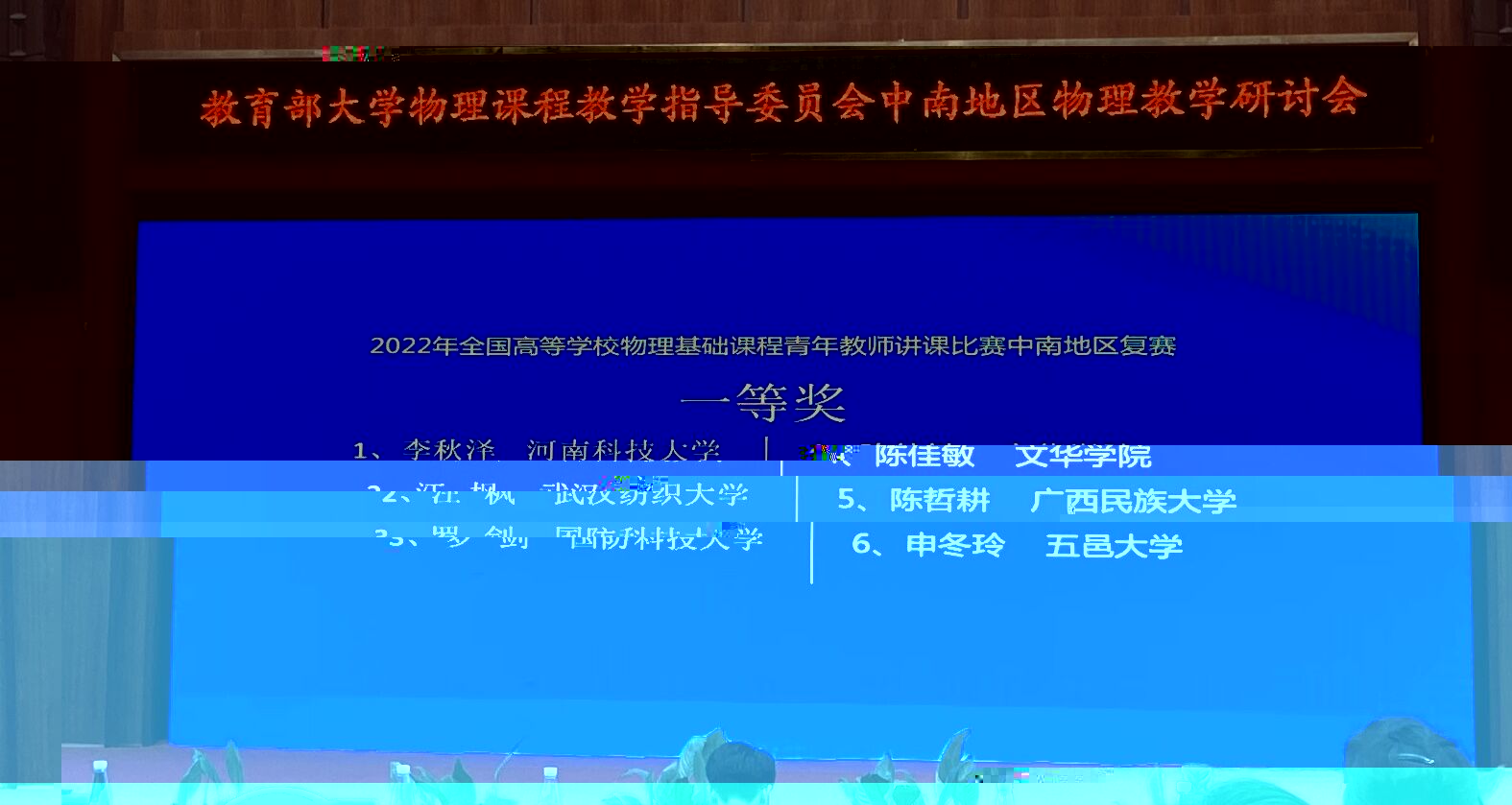 6月18日,來自中南賽區6個省份(湖北、湖南、廣東、廣西、河南、海南)的19位優勝教師同場競技,經過為期一天的激烈角逐,最終我院汪楓老師以總分第二名的好成績獲得一等獎,成功晉級全國物理基礎課程青年教師講課比賽決賽,預祝汪楓老師在全國大賽的舞台上繼續高歌猛進,取得優異成績!