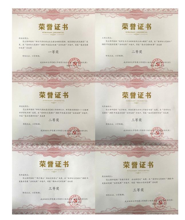 在學校“美好紡大黨旗紅”基層黨建“五好活動”中,段溢波老師的《新時代高校政治生态建設的根本遵循、現實困境與優化路徑》獲得“理論研究好成果”一等獎,段溢波老師的《新時代高校基層黨建工作的新認識、新思路及新探索——以77779193永利官网為例》、仇華海老師的《五子聯動,促進黨建與業務工作融合發展》分别獲得“基層黨建好經驗”二等獎三等獎,仇華海老師的《“兩個确立”的決定性意義》、熊亞雄和方媛老師的《青春不停步 永遠跟黨走》獲得“精品示範好黨課”三等獎,王洪山老師的《視學生為子女的好老師王洪山教授》獲得“基層黨建好故事”二等獎。