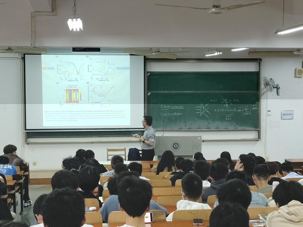 汪勝祥從該項研究的背景、專業知識、其未來發展前景三個方面展開分享。首先向同學們介紹了什麼是超構材料、超構材料的特性,讓同學們對超構材料有了基本認識。同時結合同學們現有的知識對超構材料未來的發展前景,其在多領域的實際應用進行了詳細的闡述,讓同學們對該專業知識有了更加深刻的理解。
