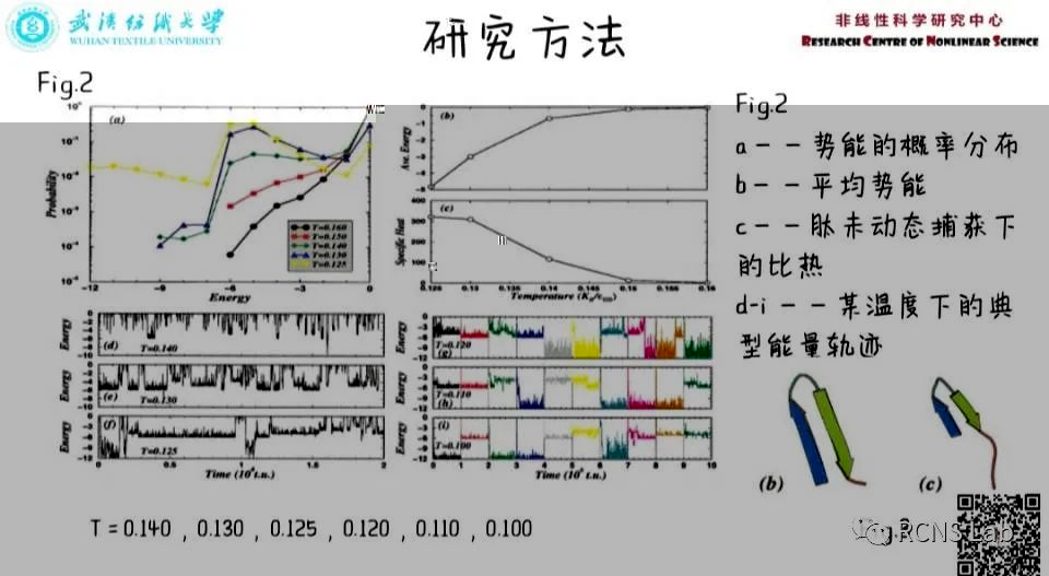 袁潔:在本次彙報中分享了一篇名為《Mechanism for the α-Helix to β-Hairpin Transition》的文獻,本文對α-Helex和β-Hairpin的轉換進行解析。富含α-Helix的蛋白質聚集成富含β-Hairpin的澱粉樣纖維,與一些緻命性疾病有關,本文主要對聚丙氨酸進行離散分子動力學模拟,根據在溫度、環境的改變下帶來的蛋白質結構狀态改變。采用Four-Bead Model簡化模型,從多角度分析β-發夾中間體的存在性,以及結構狀态改變的條件。