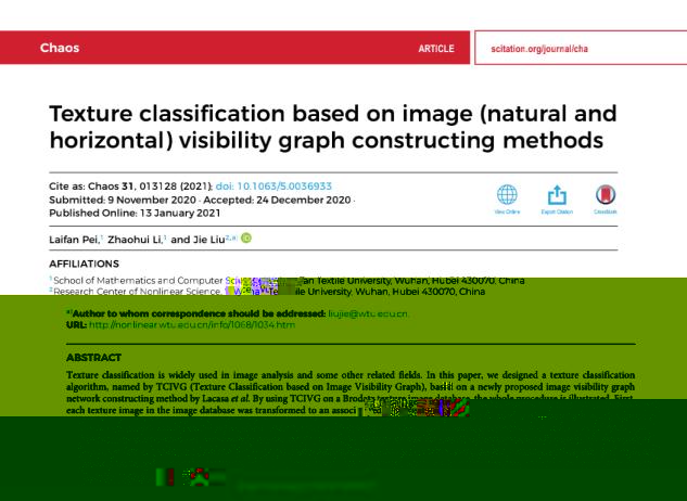 2021年1月,國際知名期刊《Chaos》在線發表中心複雜系統控制與應用團隊劉傑教授指導的研究生裴來凡、李朝晖題為“Texture Classification Based on Image (Natural and Horizontal) Visibility Graph Constructing Methods”文章。該論文通訊作者為中心劉傑教授,第一作者為研究生裴來凡和李朝輝同學。紋理分類在醫學圖像分析等領域有着廣泛的應用。本文提出了一種基于可視圖的紋理分類方法。首先,将數據集中的每個Brodatz紋理圖像轉換為相應的IVG(圖像可視圖)和IHVG(圖像水平可視圖)。然後,提取其度分布P(k),并将其輸入到不同的分類器中。主成分分析(PCA)應用于輸入向量,以減少特征數量并避免最終過拟合,并采用5-折交叉驗證程序。利用人工紋理圖像的IVG二次判别分析法(QDA)可獲得100%的分類準确率。在自然紋理圖像的IHVG上,利用線性支持向量機可以獲得94.80%的分類準确率。2021年3月,該論文在湖北省工業與應用數學學會獲得優秀論文三等獎。
