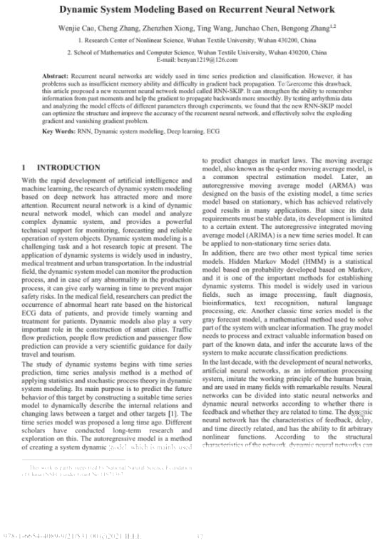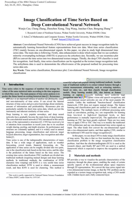 2021年7月,由中國自動化學會控制理論專業委員會、中國自動化學會、中國系統工程學會主辦,上海大學承辦,中國科學院數學與系統科學研究院、中國工業與應用數學學會、Asian Control Association、IEEE Control System Society、Institute of Control, Robotics and Systems, Korea、The Society of Instrument and Control Engineers, Japan、上海交通大學、上海市自動化學會協辦的第40屆中國控制會議(CCC2021)在上海順利召開。由中心大數據分析及應用團隊張本龔教授指導的研究生曹文潔等人題為“Image Classification of Time Series Based onDeep Convolutional Neural Network”的論文被大會接收,并在大會上交流。該文主要工作是利用深度神經網絡對心律失常數據集進行數據分類。對于時間序列類型的數據分類是研究心率(ECG)、腦電波(EEG)等疾病的重要任務和關鍵問題。随着深度學習技術的發展,卷積神經網絡(CNN)在圖像識别任務中取得了巨大的成功。本文首先采用synthetic minority oversampling technique (SMOTE)技術對數據進行預處理實現數據增強效果,然後通過遞歸圖将時間序列轉換為二維紋理圖像進行研究。最後使用特定結構的深度卷積神經網絡進行圖片分類識别。以心律失常數據為例,通過準确率、精确率、召回率、F1-score等指标對分類結果進行檢驗,驗證了該方法處理MIT-BIH心律失常數據集的有效性,驗證了将時間序列分類任務轉化為圖像識别任務這一思路的正确性,對于時間序列格式的疾病分類研究具有重要意義。