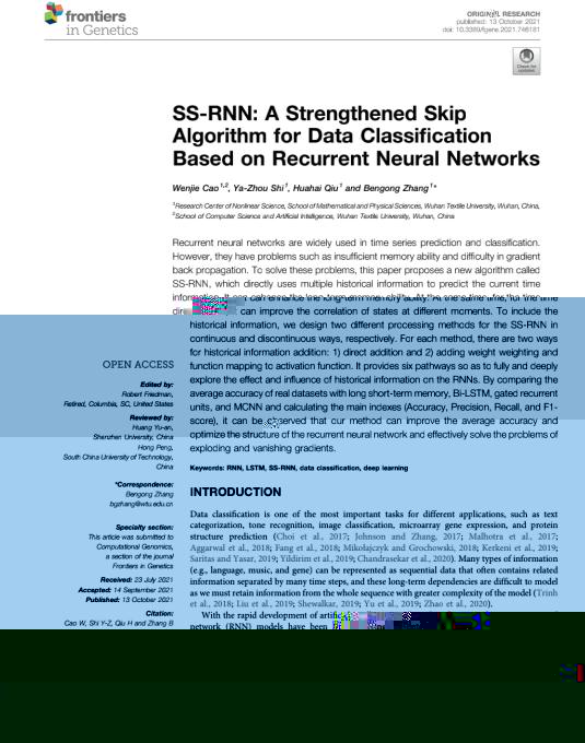 2021年10月,國際知名期刊《Frontiers in Genetics》(IF:4.6)在線發表中心大數據分析及應用團隊張本龔教授指導的研究生曹文潔題為:“SS-RNN: A strengthened skip algorithm for data classification based on recurrent neural networks”的論文。為了有效地捕獲序列數據中的長期依賴關系,文章提出SS-RNN模型,它允許曆史信息通過不同的方式再次添加至當前時刻。文章共設計了六種不同的跳躍模式,模拟添加過去信息的可能方式,并在五個與疾病相關具有不同大小和數據類型的數據集上進行測試。通過與原始LSTM、GRU、Bi-LSTM以及最新的方法RNN+GRU, RNN+LSTM, MCNN進行比較,結果表明,該方法可以顯著提高序列數據分類的準确性。此外,最好的方法是不連續的添加,且不需要加權和函數映射的方式,它能有效地解決梯度消失和梯度爆炸的問題,模型性能與跳躍階數在不同的數據集間也存在一定的關聯性。SS-RNN通過優化LSTM模型為提高序列數據的分類精度提供了一種新的思路,因此,使用者也可以通過添加SS-RNN模塊來優化自己的網絡模型,其對于疾病的分類診斷和精準治療具有重要意義。